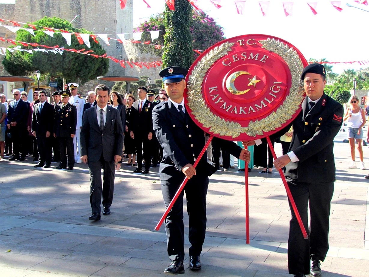 Cumhuriyet Meydanı’nda düzenlenen törene; Çeşme Kaymakamı Mehmet Maraşlı, Garnizon Komutanı İstihkâm Albay Erol Dağdeviren, Belediye Başkanı Lâl Denizli, Cumhuriyet Başsavcı Vekili Şahin Şevli, resmi kurum amirleri, siyasi parti ve sivil toplum kuruluşu temsilcileri, mahalle muhtarları, gaziler ve çok sayıda vatandaş katıldı. Sunuculuğunu Deniz Önol’un yaptığı törende; Çeşme Kaymakamlığı, Çeşme Belediyesi, siyasi partiler ve STK’lar Atatürk Anıtı’na çelenk sundu. Ardından saygı duruşunda bulunuldu ve İstiklal Marşı okundu. Kaymakam Maraşlı, Şeref Defteri’ni imzaladı.