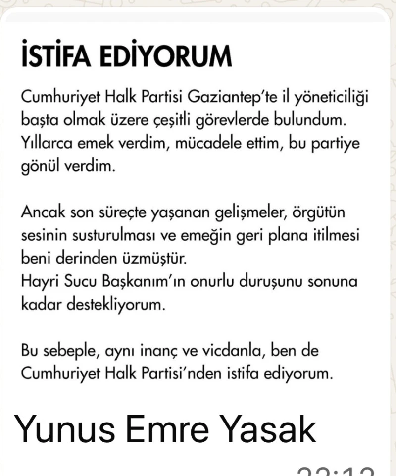 Sucu’nun ardından partinin bir diğer etkili ismi eski kurultay delegesi Bülent Tepe ile eski yönetici Yunus Emre Yasak'ın da istifa ettiğinin öğrenilmesi, CHP Gaziantep teşkilatında kongre sonrası yaşanan gerginliği daha da artırdı.