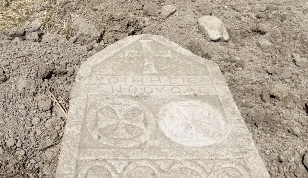 Çorum’un Alaca ilçesinde yürütülen altyapı çalışması sırasında üzerinde haç motifleri ve yazılar bulunan tarihi bir mezar taşı bulundu.