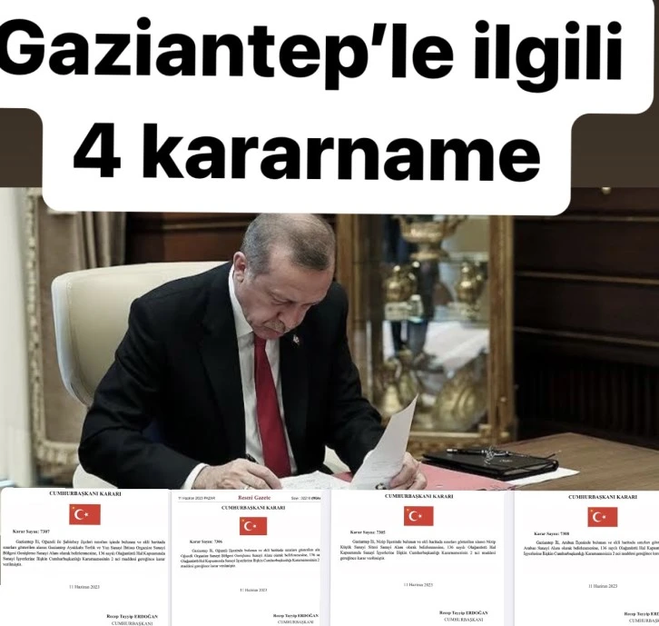 Cunhurbaşkanlığı kararnamesi ile Oğuzeli ve Şahinbey ilçe sınırları içerisinde yer alan ekte sınırları gösterilen alanın Gaziantep Terlik ve Yan Sanayi İhtisas Organize Sanayi Bölgesi Genişleme Sanayi Alanı olarak belirlenmesine ilişkin Cumhurbaşkanlığı kararnamesi resmi gazetede yayınlandı.