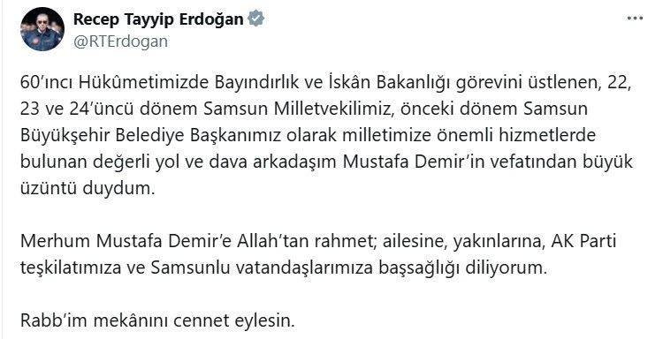 Cumhurbaşkanı Recep Tayyip Erdoğan, önceki dönem Samsun Büyükşehir Belediye Başkanı, 60’ıncı Hükümetin Bayındırlık ve İskan Bakanı Mustafa Demir’in vefatı dolayısıyla bir taziye mesajı yayımladı.