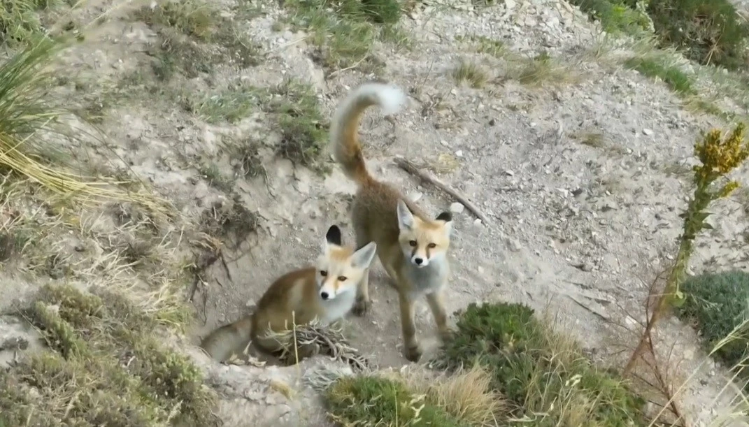Erzincan’da anne tilki ve iki yavrusu, yuvalarında drone ile görüntülendi.