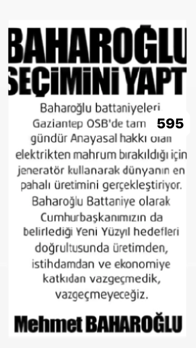 Baharoğlu, Cumhurbaşkanı Recep Tayyip Erdoğan’ın belirlediği yeni yüzyıl hedefleri doğrultusunda elektrikten mahrum bırakıldığını, jeneratörle bile olsa üretime devam ettiklerini ifade ederek, Dünyanın en pahalı üretimini yaptığını söyledi.