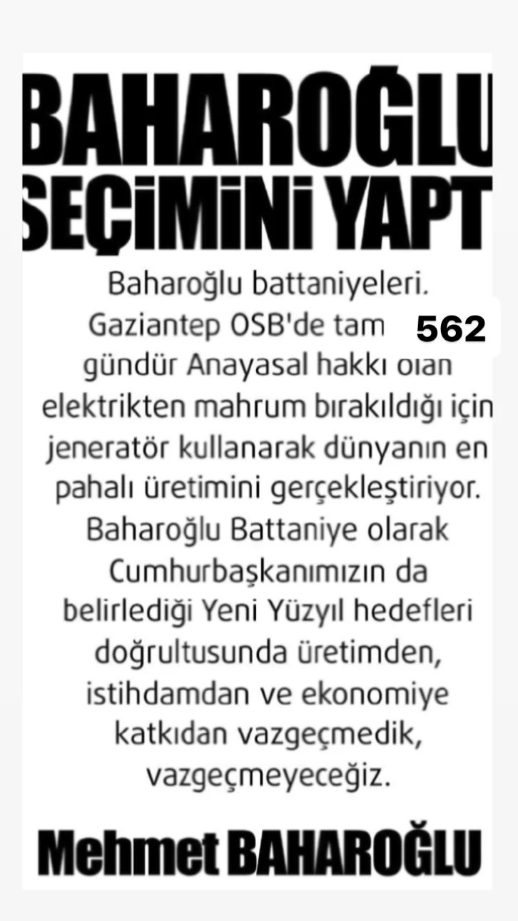 Baharoğlu Battaniye olarak Cumhurbaşkanımızın da belirlediği Yeni Yüzyıl hedefleri doğrultusunda üretimden, istihdamdan ve ekonomiye katkıdan vazgeçmedik, vazgeçmeyecegiz.”