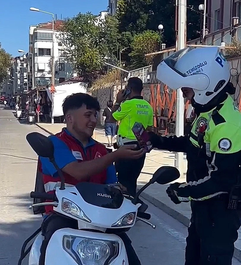 Düzce (İHA) – Düzce’nin Akçakoca ilçesinde, Düzce İl Emniyet Müdürlüğü’ne bağlı trafik şubesi ekipleri ilçede yaşanan yoğunluk sebebiyle takviye ekip olarak gitti. İlçede motosiklet ve kask uygulaması yapan trafik ekipleri kask takanlara çerez ikram ederken, takmayanlara ise cezai işlem uyguladı. Polis memurlarının samimi tavrı ise takdir topladı.