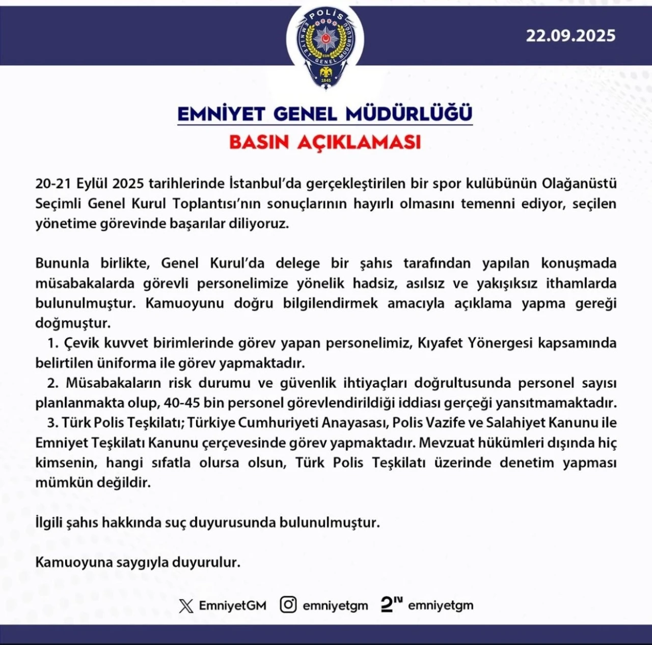 "20-21 Eylül 2025 tarihlerinde İstanbul’da gerçekleşen bir spor kulübünün Olağanüstü Seçimli Genel Kurul Toplantısı’nın sonuçlarının hayırlı olmasını temenni ediyor, seçilen yönetime görevinde başarılar diliyoruz. Bununla birlikte, Genel Kurul’da delege bir şahıs tarafından yapılan konuşmada müsabakalarda görevli personelimize yönelik hadsiz, asılsız ve yakışıksız ithamlarda bulunulmuştur. Kamuoyunu doğru bilgilendirmek amacıyla açıklama yapma gereği doğmuştur. Çevik kuvvet birimlerinde görev yapan personelimiz, Kıyafet Yönergesi kapsamında belirtilen üniforma ile görev yapmaktadır. Müsabakaların risk durumu ve güvenlik ihtiyaçları doğrultusunda personel sayısı planlamakta olup, 40-45 bin personel görevlendirildiği iddiası gerçeği yansıtmamaktadır. Türk Polis Teşkilatı, Türkiye Cumhuriyeti Anayasası, Polis Vazife ve Salahiyet Kanunu ile Emniyet Teşkilatı Kanunu çerçevesinde görev yapmaktadır. Mevzuat hükümleri dışında hiç kimsenin, hangi sıfatla olursa olsun, Türk Polis Teşkilatı üzerinde denetim yapması mümkün değildir. İlgili şahıs hakkında suç duyurusunda bulunulmuştur."