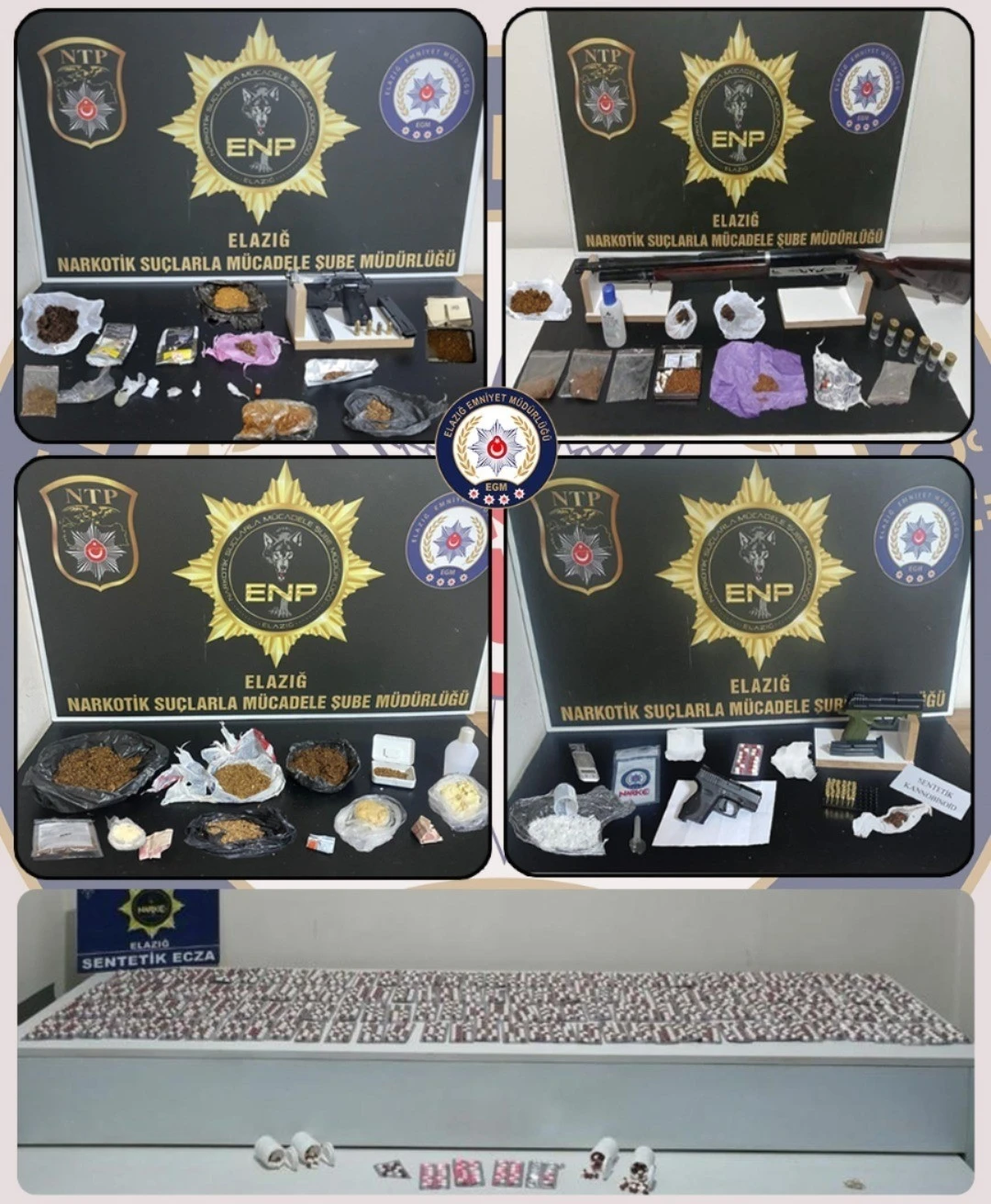 Elazığ’da polis ekipleri tarafından son 20 gün içerisinde yapılan uyuşturucu operasyonlarında 16 şüpheli tutuklandı. Elazığ Cumhuriyet Başsavcılığı koordinesinde İl Emniyet Müdürlüğü Narkotik Suçlarla Mücadele ve Asayiş Şube Müdürlüğü tarafından uyuşturucu ile mücadele çalışmaları sürüyor. Bu çerçevede son 20 gün içerisinde uyuşturucu madde kullanan ve uyuşturucu madde ticareti yapan şahıslara yönelik yapılan operasyonlarda; 39 parça halinde 1 kilo 570 gr sentetik kannabinoid maddesi, 7 parça halinde 57.40 gram metamfetamin maddesi, 8 parça halinde 41 gamr esrar maddesi, 2 bin 650 adet sentetik ecza maddesi, 3 adet ruhsatsız tabanca ve tabancalara ait 51 adet fişek, 1 adet ruhsatsız pompalı tüfek ve 6 adet kartuş ile 1 adet hassas terazi ele geçirildi. Operasyonlarda yakalanan şüphelilerden 16’sı ‘Uyuşturucu Madde Ticareti Yapmak’ suçundan tutuklanırken 11 şüpheli şahsa adli kontrol kararı verildi. Ayrıca 45 şüpheli şahsa ise ‘Uyuşturucu Madde Kullanmak’ suçundan adli işlem yapıldığı bildirildi.