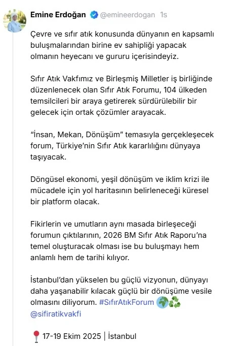 Cumhurbaşkanı Recep Tayyip Erdoğan’ın eşi Emine Erdoğan, 17-19 Ekim’de İstanbul’da düzenlenecek Sıfır Atık Forumu’na ilişkin, "’İnsan, Mekan, Dönüşüm’ temasıyla gerçekleşecek forum, Türkiye’nin Sıfır Atık kararlılığını dünyaya taşıyacak. Döngüsel ekonomi, yeşil dönüşüm ve iklim krizi ile mücadele için yol haritasının belirleneceği küresel bir platform olacak" ifadelerini kullandı.
