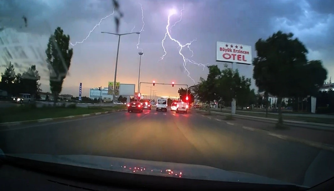 Erzincan’da gök gürültülü sağanak yağış etkili oldu. Art arda çakan şimşekler araç kamerasına yansıdı.