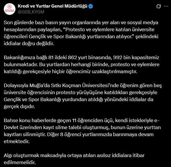 KYK’nın sosyal medya hesabından yapılan açıklamada, bazı basın yayın organlarında yer alan ve sosyal medya hesaplarında paylaşılan ‘Protesto ve eylemlere katılan üniversite öğrencileri Gençlik ve Spor Bakanlığı yurtlarından atılıyor’ iddialarının doğru olmadığı belirtildi. Gençlik ve Spor Bakanlığı’na bağlı 81 ildeki 862 yurt binasında 992 bin kişilik kapasitenin bulunduğu ifade edilen açıklamada, "Bu yurtlardan herhangi birinde protesto ve eylemlere katıldığı gerekçesiyle hiçbir öğrencimiz uzaklaştırılmamıştır. Dolayısıyla Muğla’da Sıtkı Koçman Üniversitesi’nde öğrenim gören 5 üniversite öğrencisinin protesto yürüyüşüne katıldıkları gerekçesiyle Gençlik ve Spor Bakanlığı yurdundan atıldığı yönündeki iddialar da gerçek dışıdır. Bahse konu haberlerde geçen 11 öğrenciden 3’ü, kendi istekleriyle e-Devlet üzerinden kayıt silme talebi oluşturmuş, bunun üzerine yurttan kayıtları silinmiştir. Diğer 8 öğrenci yurtlarımızda barınmaya devam etmektedir. Algı oluşturmak maksadıyla ortaya atılan asılsız iddialara itibar edilmemelidir" ifadelerine yer verildi.
