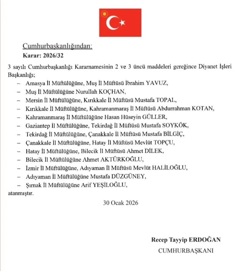 3 sayılı Cumhurbaşkanlığı Kararnamesi’nin 2 ve 3’üncü maddeleri gereğince yapılan atamalarla Türkiye genelinde birçok il müftüsünün görev yeri değiştirildi. Gaziantep’in yanı sıra Amasya, Muş, Mersin, Kırıkkale, Kahramanmaraş, Tekirdağ, Çanakkale, Hatay, Bilecik, İzmir, Adıyaman ve Şırnak il müftülüklerinde de yeni görevlendirmeler yapıldı.