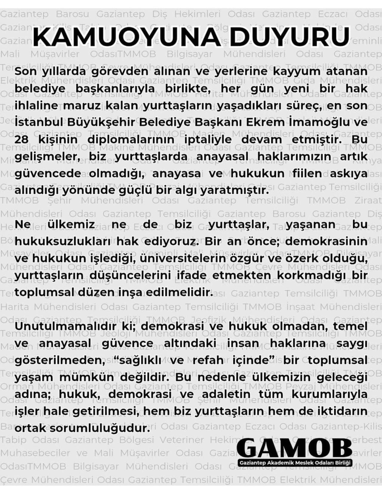 Gaziantep Akademik Meslek Odaları Birliği adına yapılan açıklamada'yı resmi instağram sayfasında yayınlayan Gaziantep Lisesi Mezunları Derneği'nin, siyasal tartışmaların içerisinde yer alması hoş karşılanmadı.