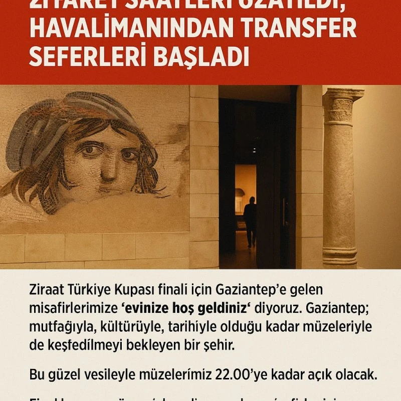 Gaziantep Büyükşehir Belediye Başkan Yardımcısı Hakan Aslansoy yaptığı açıklamada, “Yarın akşam oynanacak Ziraat Türkiye Kupası finali için şehrimize gelen tüm misafirlerimize ‘evinize hoş geldiniz’ diyoruz. Gaziantep; mutfağıyla, kültürüyle, tarihiyle olduğu kadar müzeleriyle de keşfedilmeyi bekleyen bir şehir,” diyerek tüm konukları şehrin kültürel zenginliklerini tanımaya davet etti.