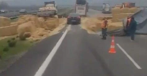 <div>Gaziantep Nurdağı oto yolunda saman yüklü tır devrildi. Trafik Polisleri olay yerinde trafiğin akışını kontrollü sağlıyor.</div>