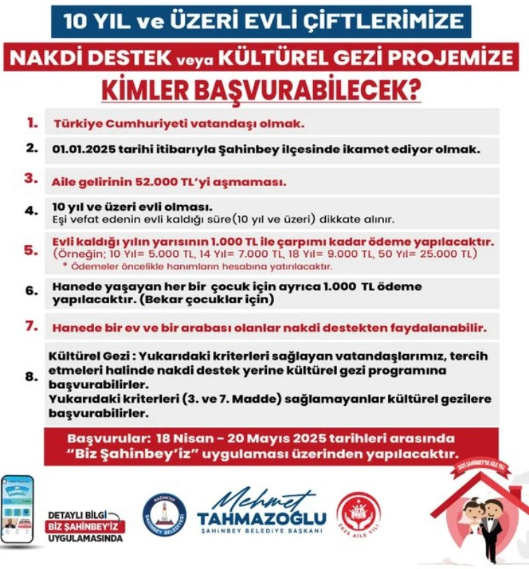 Tahmazoğlu paylaşımında, “Kıymetli hemşehrilerim, 10 yıl ve üzeri evli çiftlerimize yönelik hazırladığımız destek paketimizi sizlerle paylaşmıştık. Şimdi, bu desteğin tüm detaylarını içeren görselimizi sizlere sunuyoruz. Başvurularınızı 18 Nisan itibarıyla ‘Biz Şahinbey’iz’ uygulamamız üzerinden kolayca gerçekleştirebilirsiniz.” ifadelerine yer verdi.