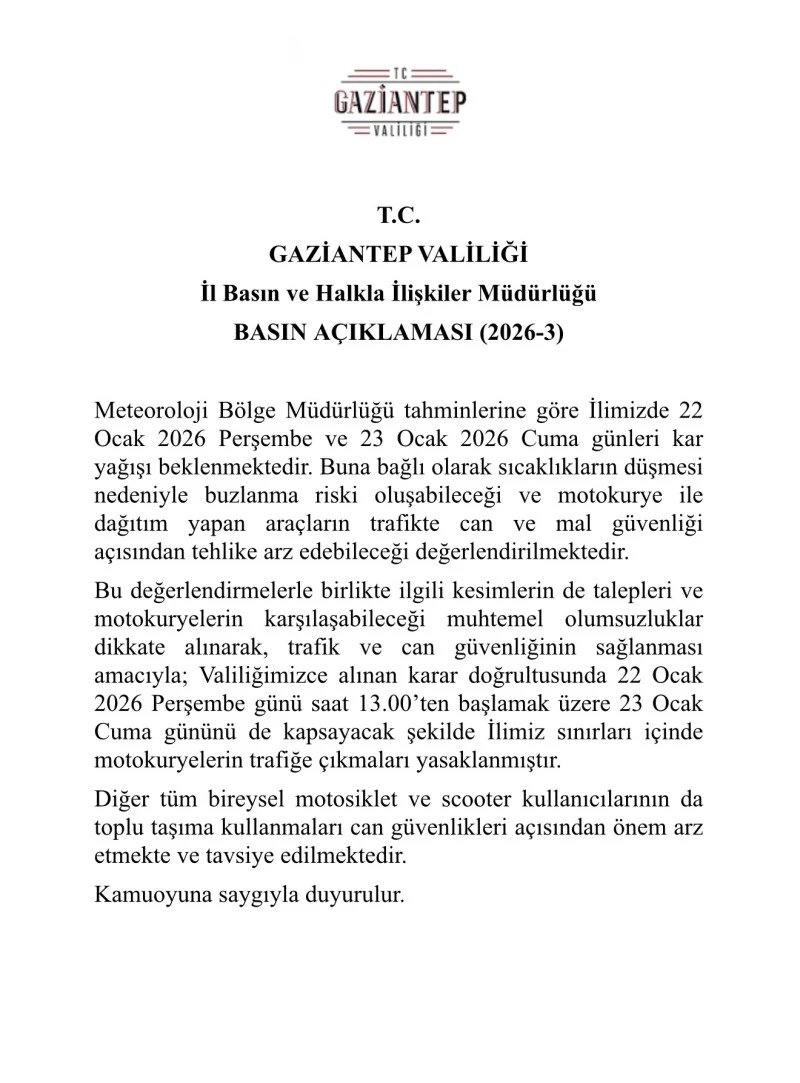 Bu kapsamda alınan kararla, 22 Ocak 2026 Perşembe günü saat 13.00’ten itibaren, 23 Ocak 2026 Cuma gününü de kapsayacak şekilde, Gaziantep il sınırları içerisinde motokuryelerin trafiğe çıkması yasaklandı.