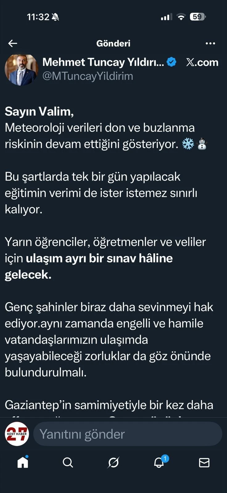 GTO Başkanı Yıldırım, sosyal medya hesabından yaptığı paylaşımda, Meteoroloji verilerinin don ve buzlanma riskinin devam ettiğini gösterdiğine dikkat çekerek, eğitimde verimliliğin ve ulaşım güvenliğinin olumsuz etkileneceğini vurguladı.
