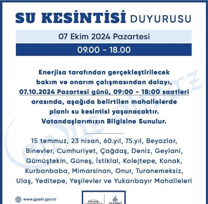Gaziantep Su ve Kanalizasyon İdaresi (GASKİ), 7 Ekim 2024 Pazartesi günü saat 09.00 - 18.00 arasında gerçekleştirilecek bakım ve onarım çalışmaları nedeniyle çeşitli mahallelerde planlı su kesintisi yaşanacağını duyurdu. Enerjisa tarafından yapılacak çalışmalar kapsamında su kesintisinden etkilenecek mahalleler şunlardır: