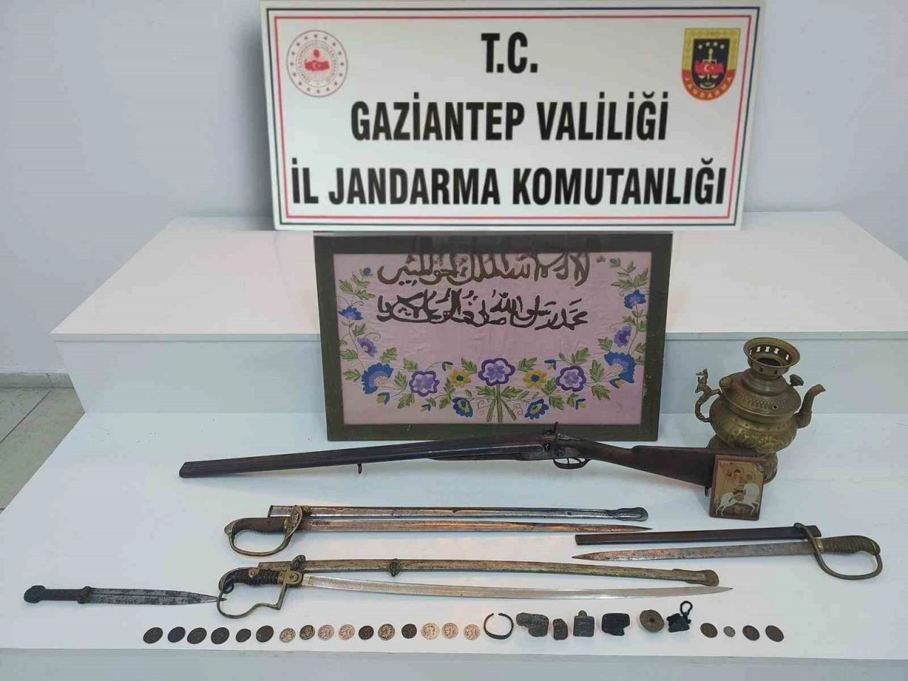 Gaziantep’te İl Jandarma Komutanlığı ve adli makamların koordinesiyle tarihi eser kaçakçılığına yönelik operasyon yapıldı. Operasyon çerçevesinde, tarihi eser kaçakçılığı yaptığı tespit edilen ve Şahinbey ilçesinde ikamet eden C.K. isimli şahsın ikametinde arama yapıldı. Aramada tarihi eser niteliğinde 20 adet sikke, 4 adet taş mühür, 3 adet kılıç, 2 adet tablo, 1 adet tüfek, 1 adet kama, 1 adet bilezik, 1 adet semaver ve 3 adet obje ele geçirildi.