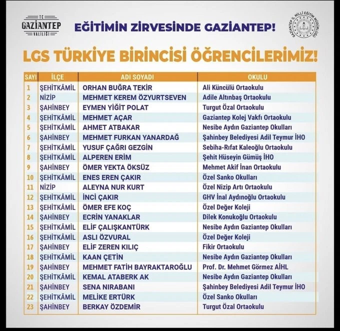 Gaziantep Valiliği’nin yayımladığı listeye göre, Şehitkamil, Şahinbey ve Nizip ilçelerindeki çeşitli okullardan öğrenciler büyük başarıya imza attı. Öne çıkan bazı okullar arasında Gaziantep Kolej Vakfı, Özel Sanko Okulları, Nesibe Aydın Gaziantep Okulları, Ali Küncülü Ortaokulu ve Şehit Hüseyin Gümüş İmam Hatip Ortaokulu yer aldı.