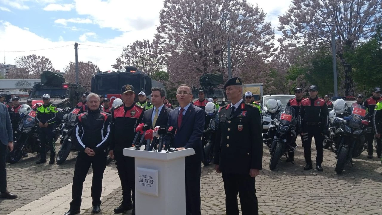Gaziantep Valisi Kemal Çeber, İl Jandarma Komutanı Tümgeneral Halil Şen ve İl Emniyet Müdürü Celal Özcan ile birlikte Gaziantep'in Huzuru Güvenlik Basın Toplantısı'nda güncel asayiş bilgilerini paylaşarak gündeme dair açıklamalarda bulunuyor.