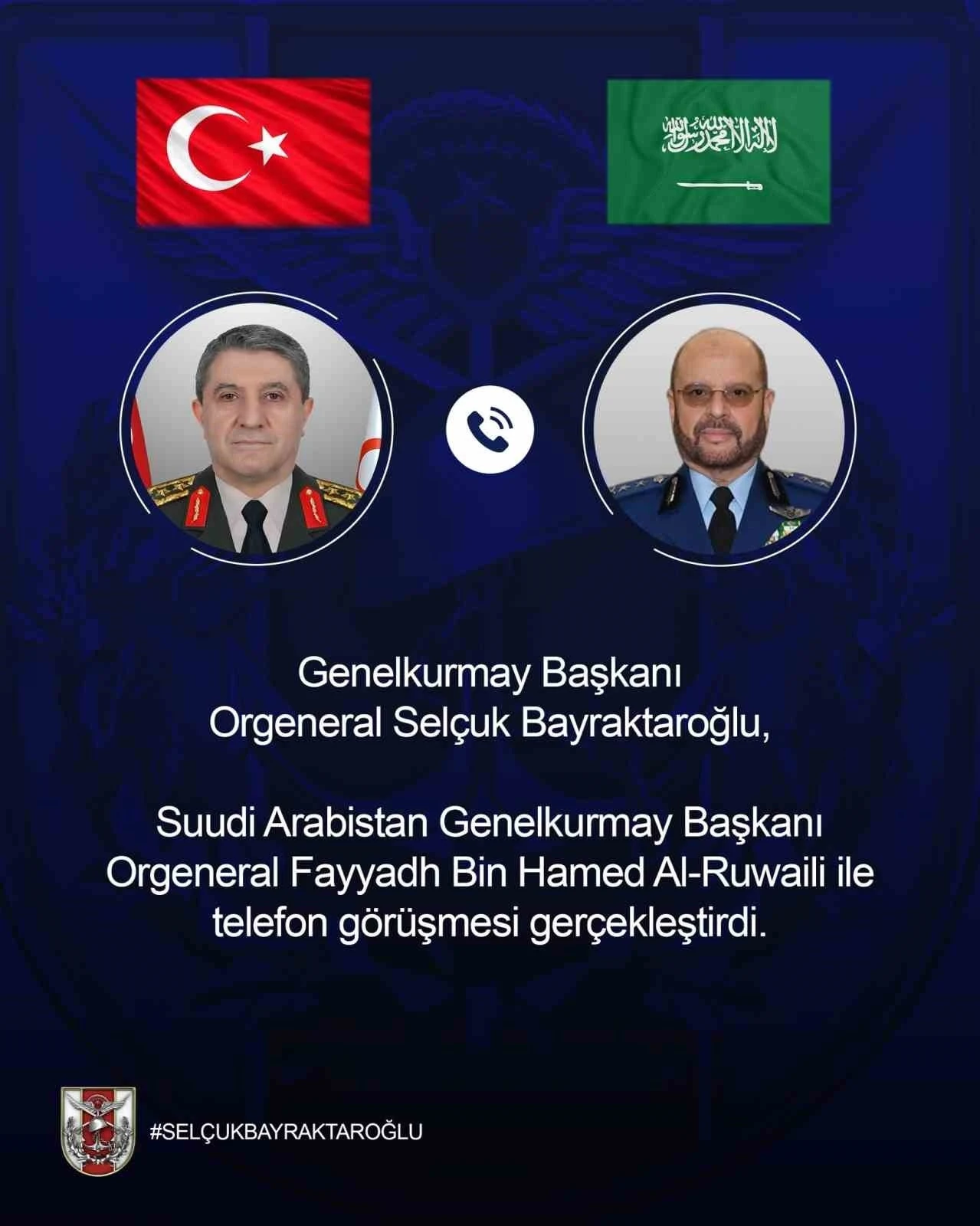 Genelkurmay Başkanı Orgeneral Selçuk Bayraktaroğlu, Suudi Arabistan Genelkurmay Başkanı Orgeneral Fayyadh Bin Hamed Al-Ruwaili ile telefon görüşmesi yaptı.