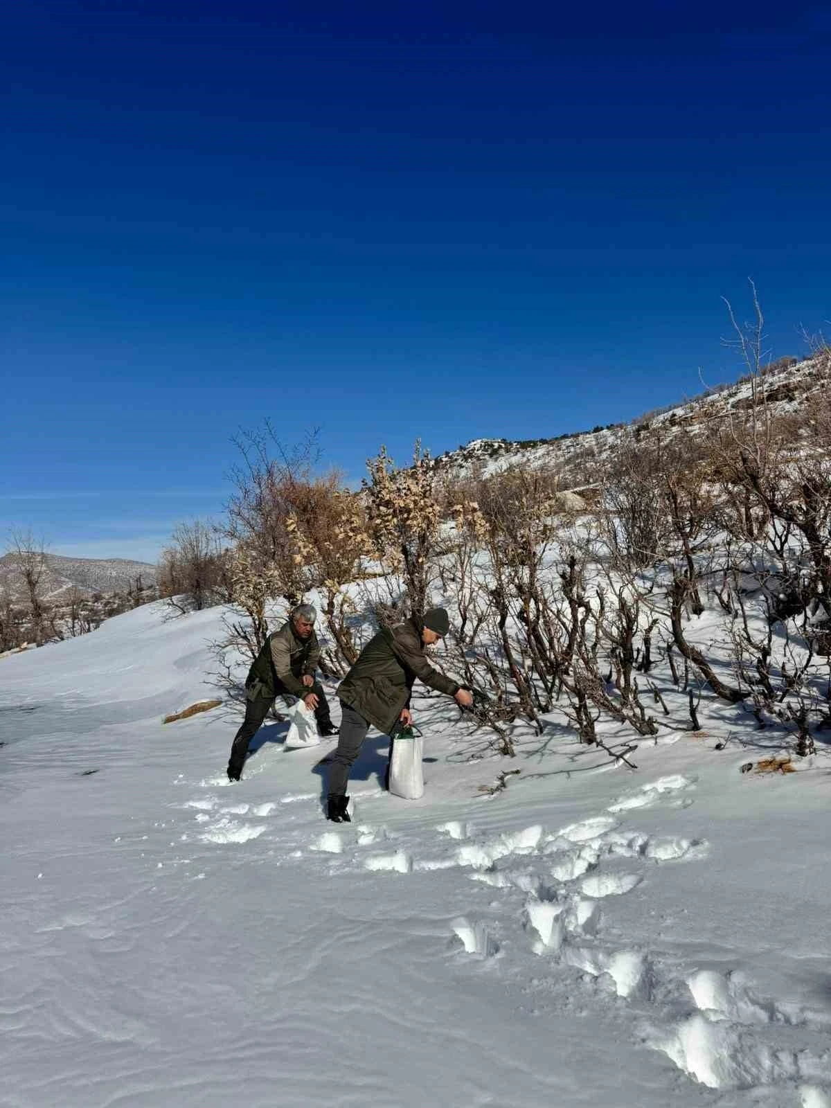 Yoğun kar yağışının doğayı beyaza bürüdüğü, yiyecek bulmayı neredeyse imkansız hale getirdiği bu zorlu kış günlerinde, Batman’ın Gercüş İlçe Orman İşletme Müdürlüğü personeli doğaya yiyecek bıraktı.