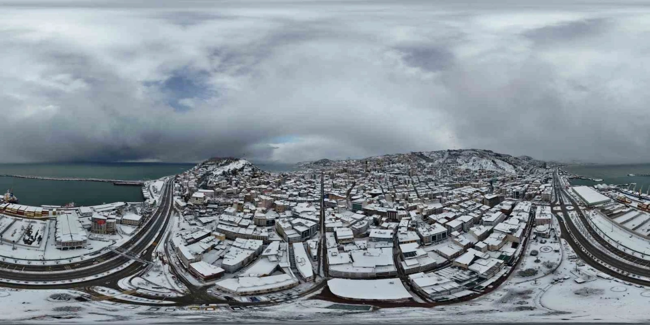 Giresun’da etkili olan kar yağışının ardından şehir beyaz örtüyle kaplanırken, ortaya çıkan manzaralar dron ile görüntülendi. Karadeniz’in mavisiyle bütünleşen beyaz örtü, kente adeta kartpostalları aratmayan görüntüler kazandırdı.