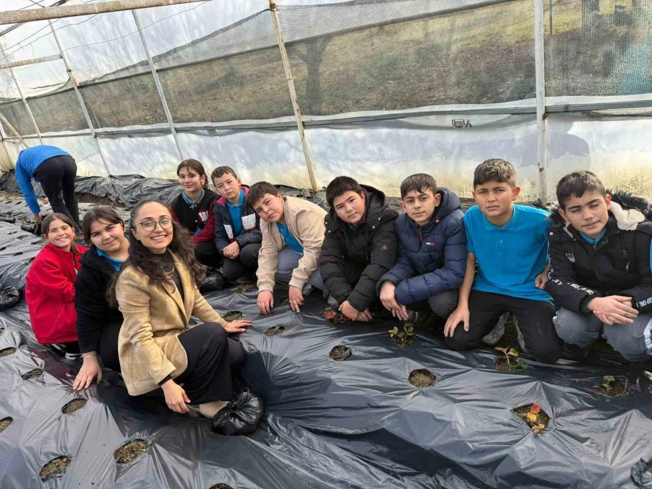 Manisa’nın Gördes ilçesine bağlı Çiğiller İlköğretim Okulu bahçesinde, "Sevgimizi Seramızda Büyütüyoruz" projesi kapsamında 150 metrekarelik alanda kurulan serada çilek dikimi gerçekleştirildi.