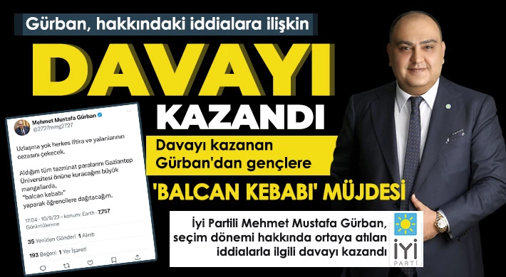 İyi Parti Gaziantep Milletvekili Mehmet Mustafa Gürban, seçim döneminde hakkında ortaya atılan 'dolandırıcı, küçük yatırımcıyı dolandırdı, defalarca ceza yedi' tarzında söylemlerde bulunan medya kuruluşlarına dava açtı. İyi Partili Mehmet Mustafa Gürban'ın söz konusu iddialara ilişkin açtığı dava sonuçlandı. Mahkeme heyeti, bahsi geçen iddiaları ortaya atanların Mehmet Mustafa Gürban'a tazminat ödemesine hükmetti. Mahkeme kararının ardından açıklamalarda bulunan İyi Parti Gaziantep Milletvekili Mehmet Mustafa Gürban, "Uzlaşma yok, herkes iftira ve yalanlarının cezasını çekecek. Aldığım tüm tazminat paralarını Gaziantep Üniversitesi önünde kuracağım büyük mangallarda 'balcan kebabı' yaparak öğrencilere dağıtacağım" ifadelerini kullandı.