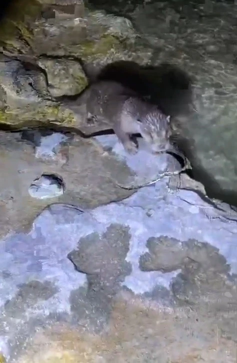 Şanlıurfa’nın tarihi ve turistik ilçesi Halfeti’de gece saatlerinde görülen su samuru, yüzerek kıyıya geldi. Kıyıya paralel atılan ağın içerisinden geçen su samuru, karaya çıkarak avlanan balıkçının yanına gitti. Meraklı gözlerle bir süre balıkçıyı izleyen sevimli hayvan, daha sonra suya atlayarak gözden kayboldu.