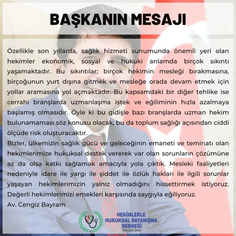 Bizler, ülkemizin sağlık gücü ve geleceğinin emaneti ve teminatı olan hekimlerimize hukuksal destek vererek var olan sorunların çözümüne az da olsa katkı sağlamak amacıyla yola çıktık. Mesleki faaliyetleri nedeniyle idare ile yargı ile şiddet ile özlük hakları ile ilgili sorunlar yaşayan hekimlerimizin yalnız olmadığını hissettirmek istiyoruz. Değerli hekimlerimizi emekleri karşısında saygıyla eğiliyoruz."