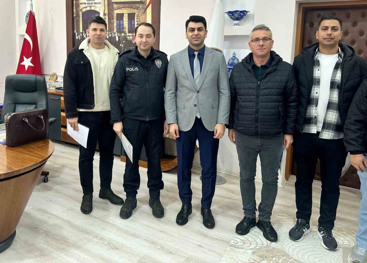 Kaymakam Muhammet Samet Bahar, İlçe Emniyet Amiri Ayhan Istık, Polis Memurları Serdar Yumrutaş, Emre Ceran, Sercan Akgün ve Mehmet Tunahan Ceyhan’a ilçede meydana gelen olayların aydınlatılmasında, ilçenin huzur ve güvenliğinin sağlanmasında göstermiş oldukları özveriden dolayı teşekkür ederek, başarı belgesi takdim etti.