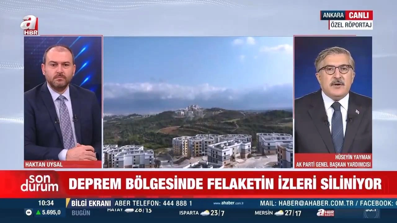Türkiye Büyük Millet Meclisi Dijital Mecralar Komisyonu ve AK Parti Genel Başkan Yardımcısı Hüseyin Yayman A Haber'e özel açıklamalarda bulundu. Hüseyin Yayman, "Deprem bölgesinde çalışmalar sürüyor. Hatay yeniden ayağa kalkıyor. Bilgi sahibi olmadan fikir sahibi olmaya çalışanlar var. Yıl sonunda bütün temeller atılmış bütün herkes evlerine yerleşmiş olacaklar." dedi.