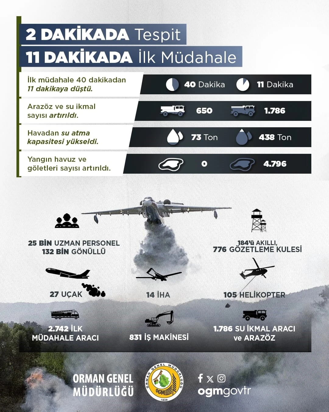 Orman yangınlarında havadan yapılan su atımlarının yangının enerjisinin düşürmeye yönelik olduğu, kara ekiplerinin ise yangının ilerleyişini durdurma, önündeki yanıcıları temizleme, etrafını çevirme ve gerekirse karşı ateş çıkarma gibi teknikler kullandığı belirtildi. Coğrafi şartlara göre farklı tonajlarda ve özelliklerde 27 uçak ve 105 helikopterden oluşan Türkiye hava filosunun karma yapıda güçlü bir filo olduğuna da dikkat çekildi. "Yüzde 90’dan fazlası insan kaynaklı nedenlerle başlayan yangınları birlikte önleyebileceğimizi hatırlatıyoruz"