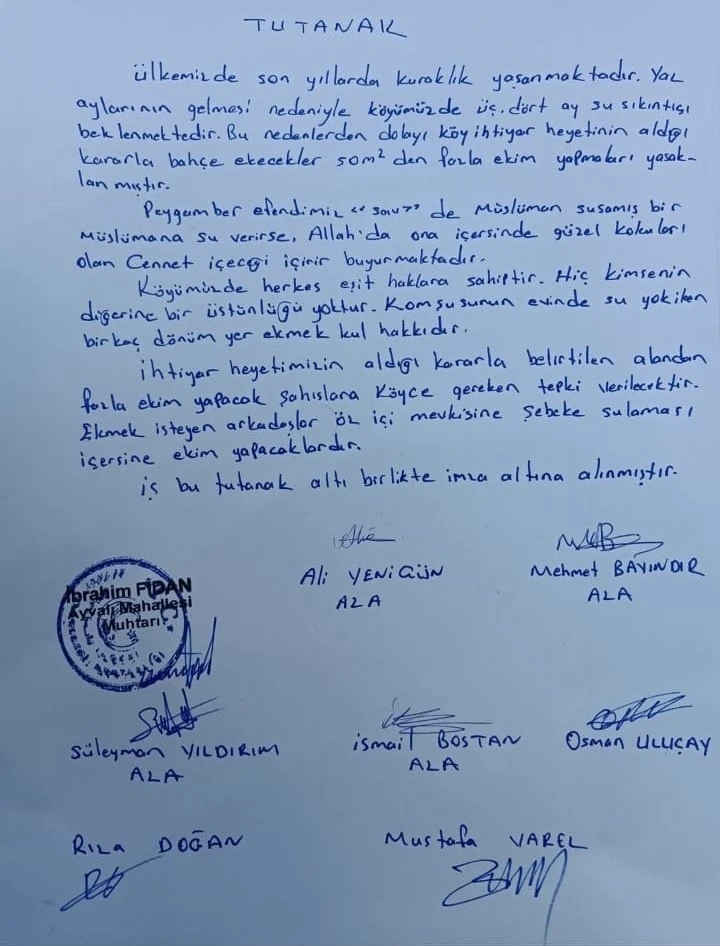 "Ülkemizde son yıllarda kuraklık yaşanmaktadır. Yaz aylarının gelmesi nedeniyle köyümüzde üç, dört ay su sıkıntısı beklenmektedir. Bu nedenlerden dolayı köy ihtiyar heyetinin aldığı kararla, bahçe ekeceklerin 50 metrekareden fazla ekim yapmaları yasaklanmıştır. Peygamber Efendimiz (SAV) "Müslüman susamış bir Müslümana su verirse, Allah da ona içerisinde güzel kokular olan cennet içeceği içirir" buyurmaktadır. Köyümüzde herkes eşit haklara sahiptir. Hiç kimsenin diğerine bir üstünlüğü yoktur. Komşusunun evinde su yokken birkaç dönüm yer ekmek kul hakkıdır. İhtiyar heyetimizin aldığı kararla, belirtilen alandan fazla ekim yapacak şahıslara köyce gereken tepki verilecektir. Ekim yapmak isteyen arkadaşlar, Öz İçi mevkiine şebeke sulaması içerisine ekim yapacaklardır."