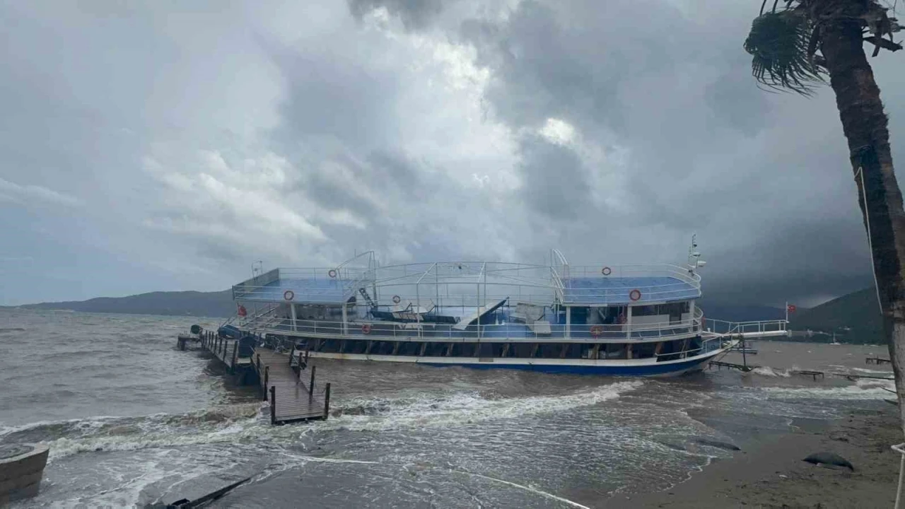 Muğla'nın marmaris ilçesinde etkili olan sağanak yağış ve fırtına sebebiyle karaya oturan tekne sayısı 4 olurken, uzunyalı mevkiinde iskeleye çarparak karaya oturan gezi teknesinin kurtarılması için çalışma başlatıldı.