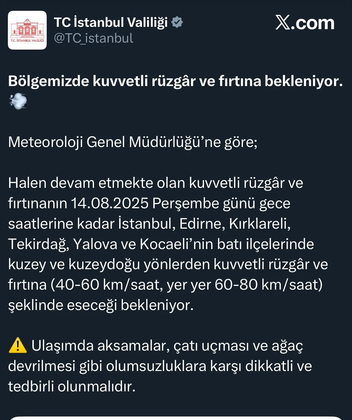 İstanbul Valiliği tarafından Meteoroloji Genel Müdürlüğü’nün hava tahmin verilerine göre, vatandaşlara kuvvetli rüzgar ve fırtına uyarı yapıldı. Yapılan açıklamada, "Bölgemizde kuvvetli rüzgar ve fırtına bekleniyor. Meteoroloji Genel Müdürlüğü’ne göre; halen devam etmekte olan kuvvetli rüzgar ve fırtınanın 14 Ağustos Perşembe günü gece saatlerine kadar İstanbul, Edirne, Kırklareli, Tekirdağ, Yalova ve Kocaeli’nin batı ilçelerinde kuzey ve kuzeydoğu yönlerden kuvvetli rüzgâr ve fırtına (40-60 km/saat, yer yer 60-80 km/saat) şeklinde eseceği bekleniyor. Ulaşımda aksamalar, çatı uçması ve ağaç devrilmesi gibi olumsuzluklara karşı dikkatli ve tedbirli olunmalıdır" ifadelerine yer verildi.