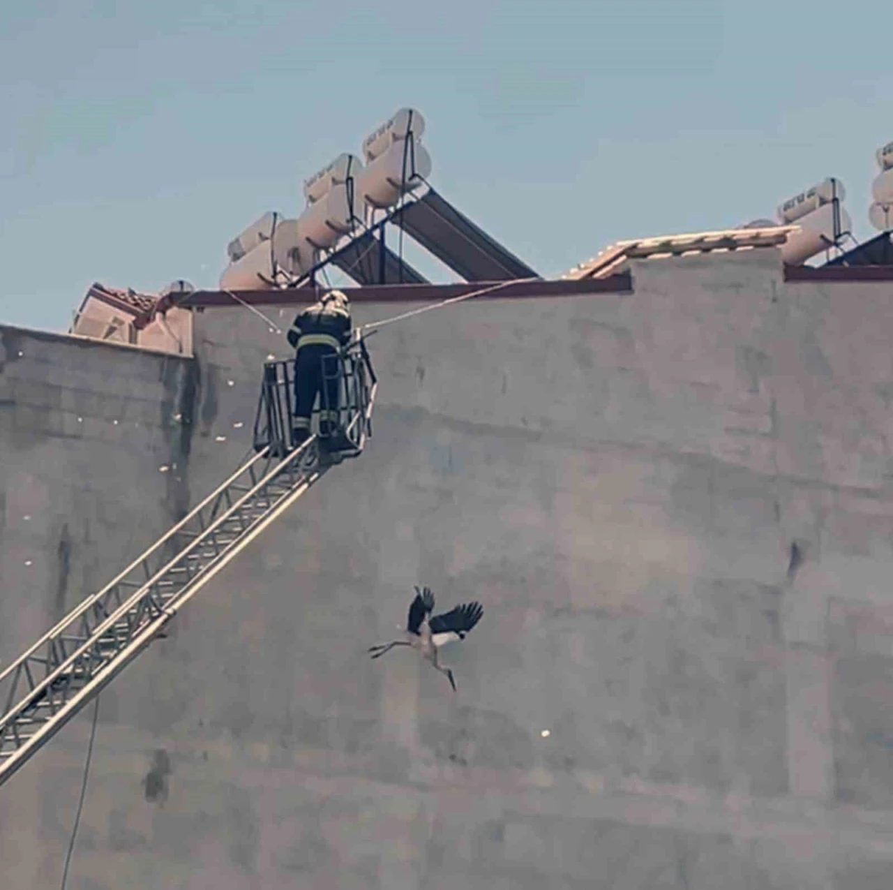 Apartmanın dairesinin en üst katında kabloyla dolanan leylek itfaiye ekiplerinin merdiven ile ulaşmasının ardından kurtarılarak tekrar doğal yaşam alanına bırakıldı.