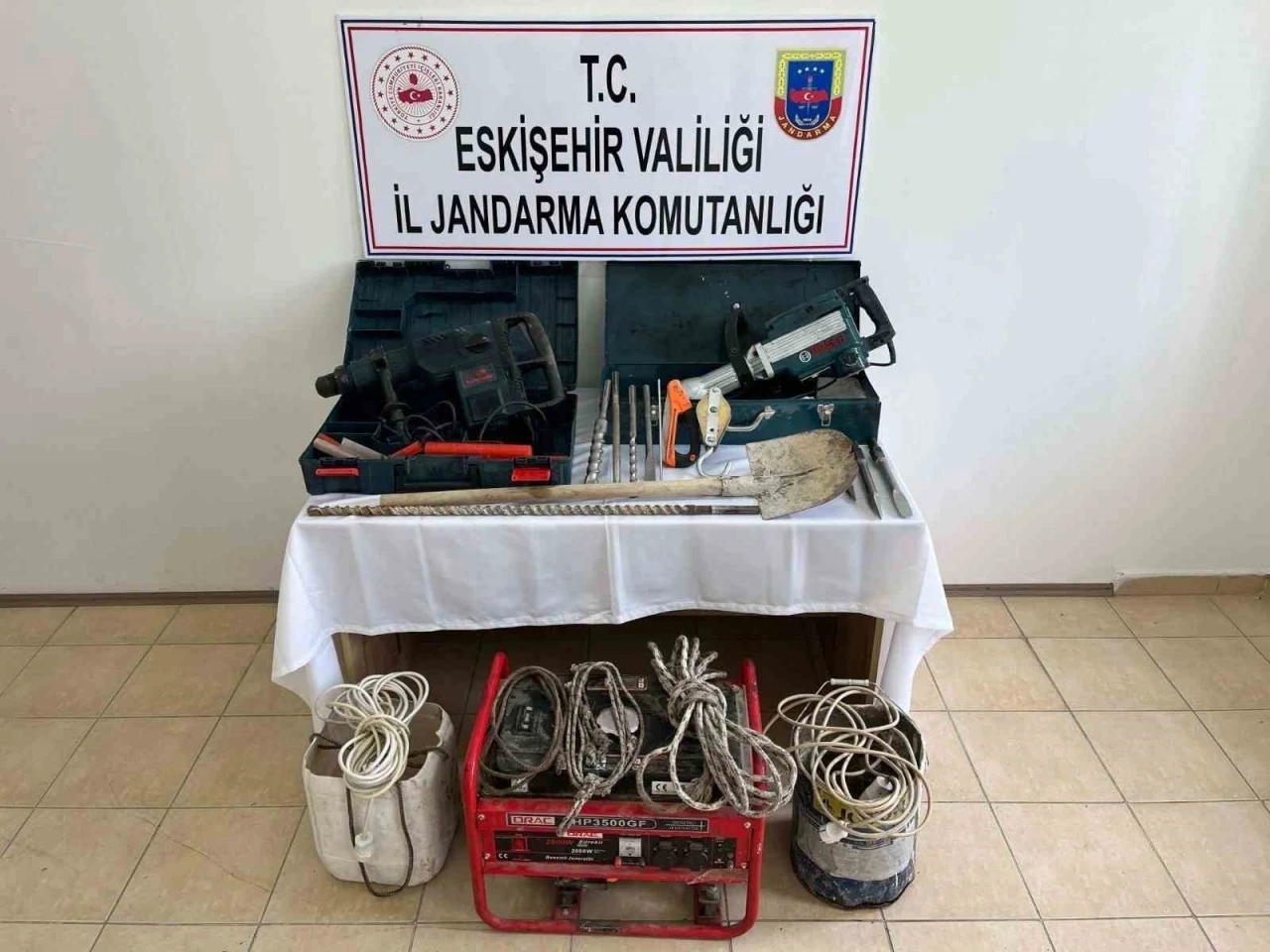 Eskişehir İl Jandarma Komutanlığı ekipleri, Seyitgazi ilçesinde şüpheli şahısların kaçak kazı yapacağı bilgisi üzerine çalışma başlattı. Ekipler, 3 şahsı Seyitgazi ilçesinde bulunan ormanlık alanın içinde kaçak kazı yaparken suçüstü yakaladı. Kazı alanında 1 adet jeneratör, 2 adet kırıcı delici matkap, 16 metre elektrik kablosu, 16 metre ip ve muhtelif kazı malzemeleri ele geçirildi. Gözaltına alınan şüpheliler hakkında soruşturma başlatıldı.