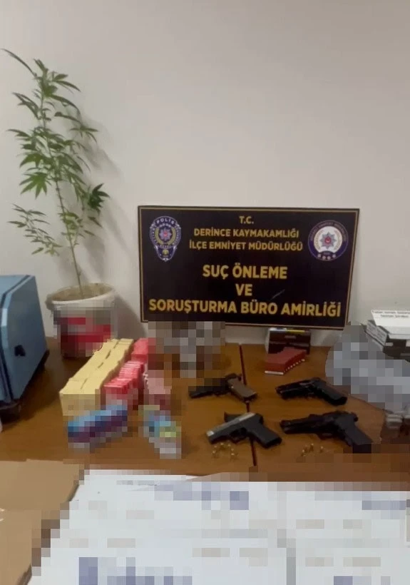 Derince Emniyet Müdürlüğü ekipleri Derince’de 5 iş yeri ve 3 ikamete operasyon düzenledi. Yapılan aramalarda, 51 bin 920 doldurulmuş makaron, 224 bin boş makaron, tütün ürünleri, tabancalar ve kenevir bitkisi ele geçirildi. Operasyonda 7 şüpheli hakkında gerekli adli ve idari işlemler başlatıldı.