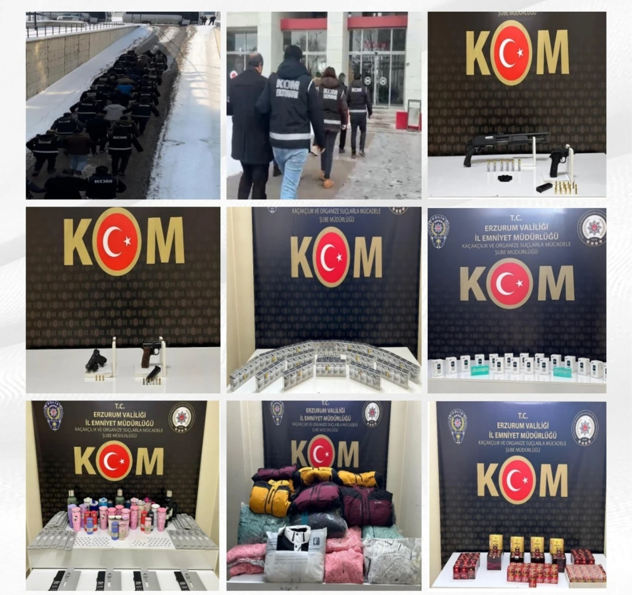 01.01.2026-01.02.2026 tarihleri arasında Kaçakçılık Ve Organize Suçlarla Mücadele Şube Müdürlüğü ekipleri tarafından Erzurum ili genelinde Şube Müdürlüğü konularına giren suçlar kapsamında; 30 planlı ve münferit operasyon düzenlendi. 115 şahıs hakkında adli tahkikat başlatıldı. Adli tahkikat başlatılan şüphelilerin 19’u hakkında adli kontrol şartı uygulanırken, 24 şüpheli tutuklanarak cezaevine teslim edildi.