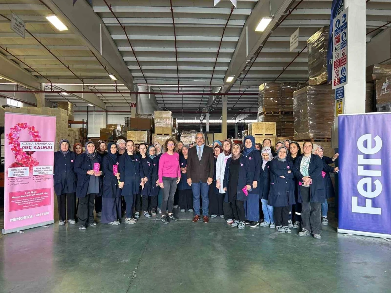 Meme Kanseri Farkındalık Ayı nedeniyle düzenlenen toplantılara çok sayıda kadın çalışan katıldı. Organize Sanayi Bölgesi’ndeki fabrikada düzenlenen toplantıda konuşan Genel Cerrahi Bölümü’nden Prof. Dr. Alper Akcan, meme kanserinin kadınlarda en sık görülen kanser türü olduğunu söyledi. Her 7-8 kadından 1 tanesinin yaşamı boyunca meme kanseri ile yüz yüze geldiğini belirten Prof. Dr. Akcan, "Dünyada her yıl 2 milyon kadın meme kanserine yakalanıyor. Ülkemizde her yıl 25 bin kadın meme kanserinden etkileniyor. Bu kadın hastaların 6’sından 1 tanesi 40 yaşının altında" diye konuştu. "Kanser yapıcılarda uzak durun"