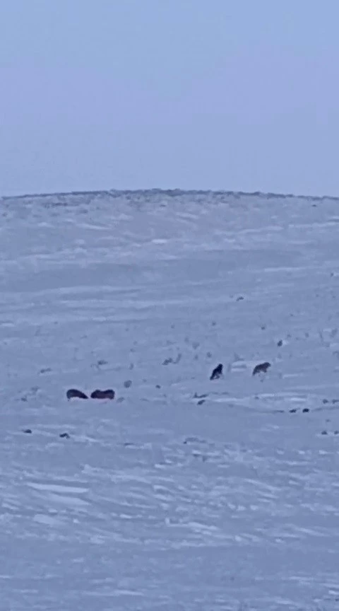 Erzurum’un Karayazı ilçesinde, gündüz saatlerinde meydana gelen olayda, aç kalan kurtlar yerleşim alanına indi.