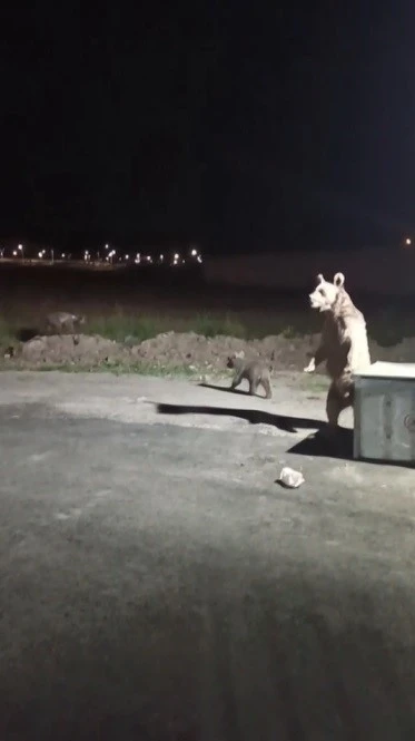 Kars’ın Sarıkamış ilçesinde boz ayılar, yavrularıyla birlikte ilçe merkezinde cirit atıyor. TOKİ Lojmanlarına kadar gelen boz ayı ve yavruları çöp konteynırını devirerek yiyecek aradı. O anları evinin balkonunda cep telefonuyla 1 kişi kaydetmeye başladı. Vatandaştan rahatsız olan anne ayı, birden balkona doğru koşmaya başladı. Vatandaş can havliyle balkondan içeri girdi. O anlar ise kayıtta olan cep telefonuyla kaydedildi.