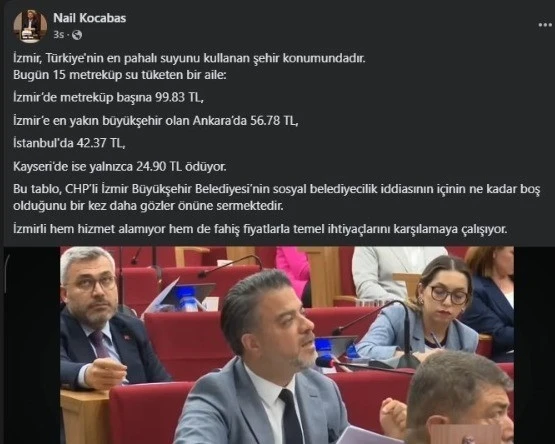 AK Parti İzmir Gaziemir Meclis Üyesi Nail Kocabaş; İzmir’de suyun metreküp fiyatının 99,83 TL olduğunu ve İzmirlinin Türkiye’nin en pahalı suyunu kullandığını söyleyerek, 24,90 TL olan Kayseri’yi örnek gösterdi.