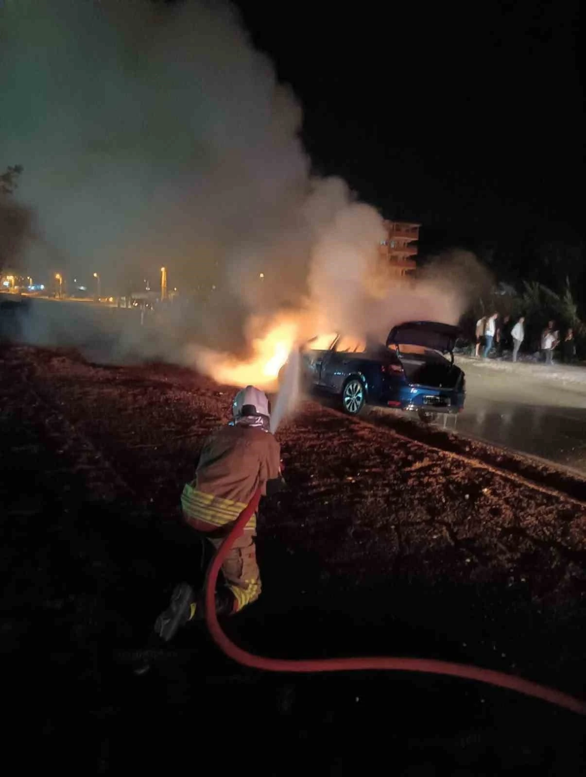 Hatay’da kazanın ardından alevlere teslim olan otomobildeki yangını itfaiye söndürdü.