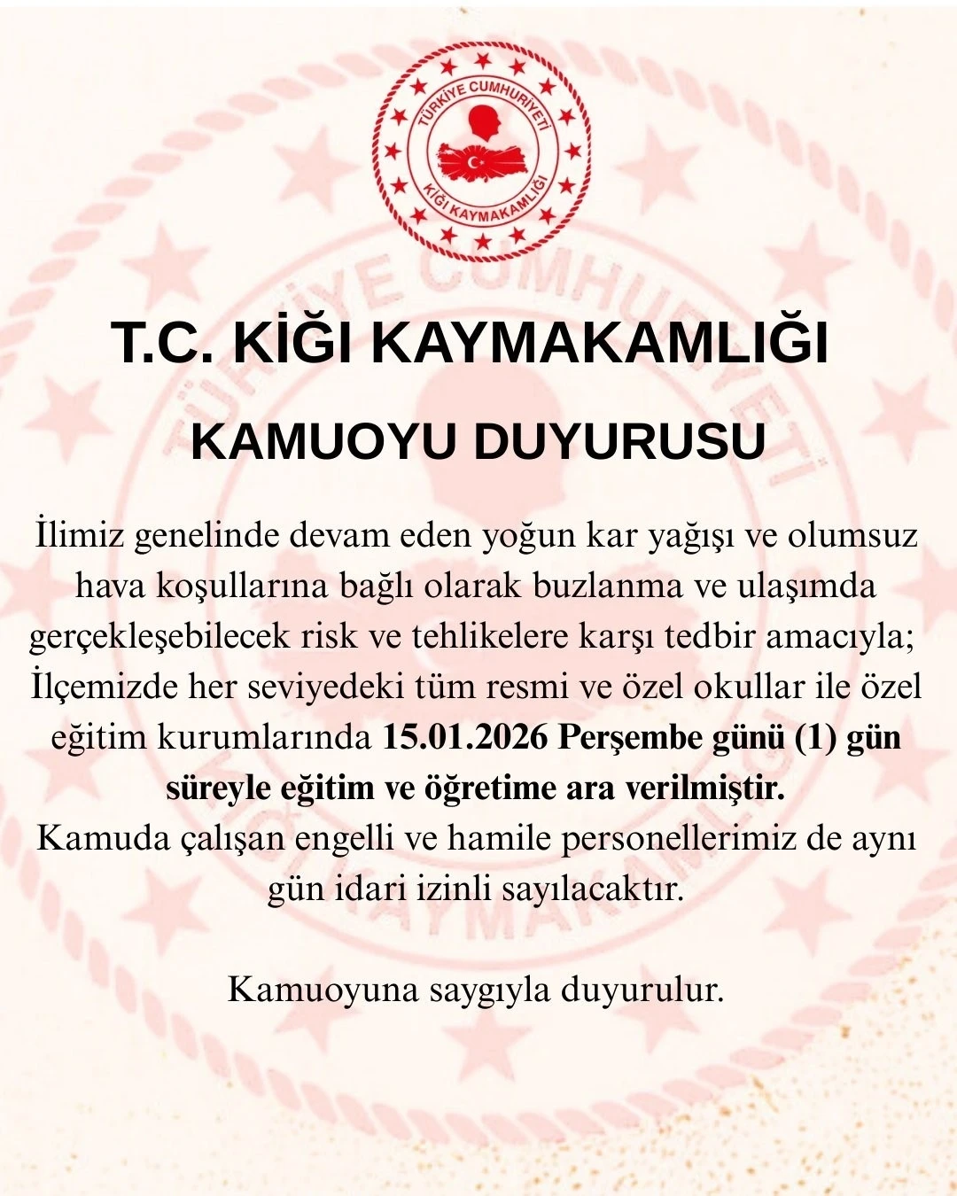 Kiğı’da kar yağışının ardından aşırı buzlanma ve don olayları devam ediyor. Bu çerçevede Kiğı kaymakamlığı tarafından yapılan açıklamada, buzlanma ve ulaşımda yaşanacak olumsuzluklar nedeniyle, 15 Ocak 2026 Perşembe günü ilçe genelinde eğitim ve öğretime 1 gün ara verildiğini ve aynı gün kamuda çalışan hamile ve engelli personellerin idari izinli sayılacağını duyurdu.