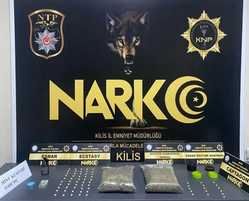 Kilis İl Emniyet Müdürlüğü Narkotik Suçlarla Mücadele Şube Müdürlüğü ekipleri, uyuşturucu madde kullanan ve ticaretini yapan kişilere yönelik operasyon düzenledi. Yapılan baskınlarda 1.083,98 gram sentetik kannabinoid, 50 adet ecstasy, 16 adet captagon, 13,17 gram esrar, 0,69 gram hint keneviri tohumu ve 1 adet esrar öğütme aparatı ele geçirildi.