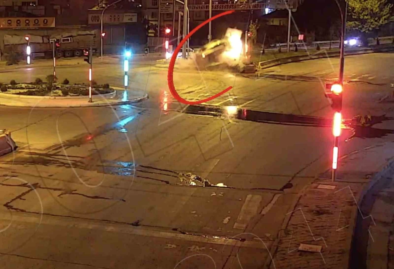 Öte yandan, kameraya yansıyan görüntülerde, bir otomobilin sürücüsünün direksiyon hakimiyetini kaybetmesi neticesinde refüjdeki beton bariyerlere ve elektrik direğine çarptığı görülüyor. Çarpmanın etkisiyle otomobilin motor kısmı alevlere teslim oluyor.